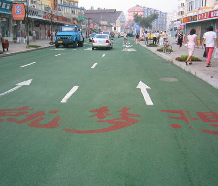 登州路的车行道采用了欧洲流行的彩色防滑路面